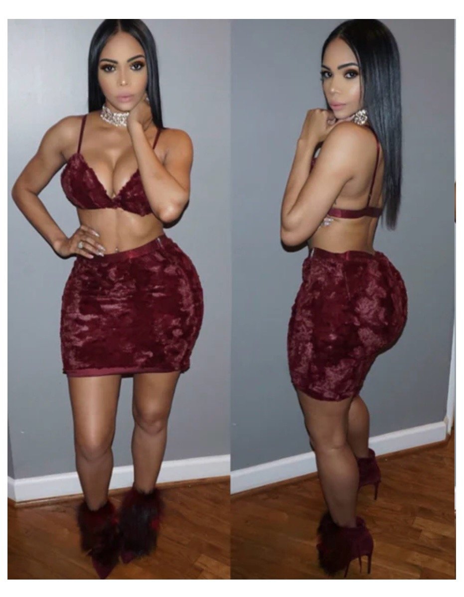 Fur bralette and matching skirt. The perfect set for Fall 🍂🍁 Straps are adjustable. Does not stretch. If you are hippy, go up a size. Model typically wears a small is wearing a medium in this.